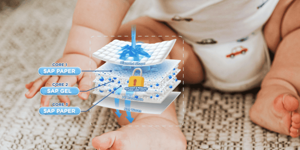 Salah satu yang cukup terasa adalah penyerapan cairannya. Miubaby menggunakan struktur 3 lapis inti polimer yang disebut dengan Triple Core SAP, jadi cairan tidak menumpuk di satu titik dan popok tidak cepat terasa berat. Ini kecil, tapi sangat berpengaruh ke kenyamanan bayi.