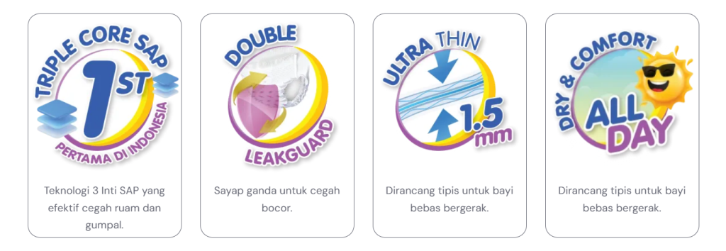 Bayi yang aktif bergerak seperti berguling, merangkak, bahkan tidur dengan posisi yang berubah-ubah membutuhkan popok dengan perlindungan ekstra untuk mencegah kebocoran. Fitur seperti Double Leak Guard membantu mengurangi risiko bocor di bagian samping, sehingga bayi dapat bergerak lebih leluasa atau tidur lebih pulas karena terhindar dari kebocoran. Ini bukan hanya soal kenyamanan bayi, tapi juga mengurangi kerepotan orang tua.